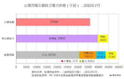 當然,開發新發電能源還有很多因素需要考慮,但至少這張圖告訴我們,光以現有的裝置容量,台灣要邁向非核家園,還是可以不造成能源轉換過度期的缺電影響,更不要說其他替代技術加入。